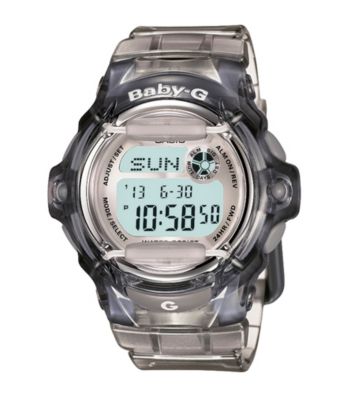 CASIO BABY-G WATCH WOMEN'S MODEL: BG169R 8 RETAIL PRICE: $79.00 200 Meter Water Resistant. Countdown Timer. Resin band. 5 Daily Alarms. Shock Resistant. 200M Water Resistant. EL Backlight with Afterglow. 25pg Databank Memory capacity: Up to 25 sets of data, each set including; Name (8 characters) and telephone number (12 digits). Other: Auto-sort. World Time. 29 time zones (30 cities), city code display, daylight saving on/off. Day Counter Automatically counts down the days from the current date to a target date. Memory capacity: 5 records (8 characters each). 5 Daily Alarms. Hourly Time Signal. Countdown Timer. Measuring Unit: 1-second. Input Range: 1 minute to 24 hours (1-minute increments and 1-hour increments). 1/100 second stopwatch. Measuring capacity: 23:59'59.99. Measuring modes: Elapsed time, split time, 1st-2nd place times. Auto Calendar (pre-programmed until the year 2099). 12/24 Hour Formats. Button Operation Tone. on/off Accuracy: +/- 30 seconds per month. Battery: CR1616. Approx. battery life: 3 years. Module 3189. References: BabyG, BG 169R 8, BG169 Size of case/total weight BG169R 45.9 x 42.6 x 15.4mm / 43g.UPC: 079767432683 Warranty: 1 year by Casio.