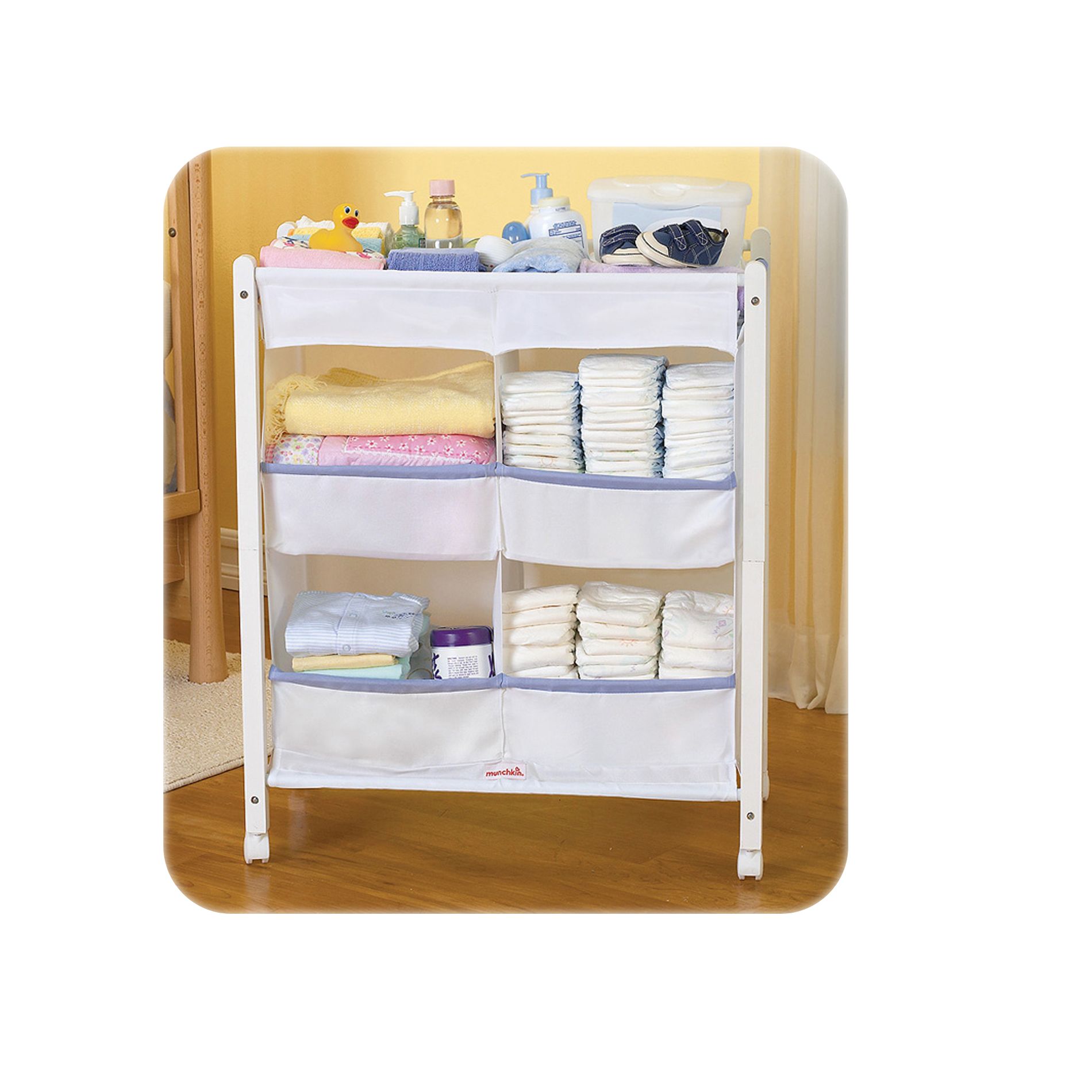 Full size: W: 27 in x H: 32 in x D: 14.5 in. Large, sturdy compartments. Easy to assemble. Baby care cart. It's the little things. A rolling organizer cart to hold baby's essentials - because while you want everything in one place, that place has a tendency to move. It's the little things. Stuff you should know: Rolling wheels make cart portable. Ideal for storing clothing, diapers, changing supplies and more. Top storage area for frequently used items. Inserts make compartments extra sturdy. Instructions enclosed. Made in China.